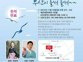 | 부산국악방송 2주년기념 공개방송 ‘국악이 좋아요'에 최윤영 (11월 10일 해운대문화회관) (0) | 2013.11.05 |