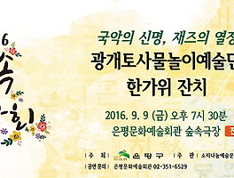 | 9월 9일(금) 서울 은평문화예술회관에서 '광개토사물놀이예술단 한가위 잔치' (0) | 2016.09.01 |