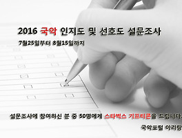 | 국악포털 아리랑에서 실시하는 '2016 국악인 대상 온라인 설문조사' 에 참여 부탁드립니다. (0) | 2016.08.07 |